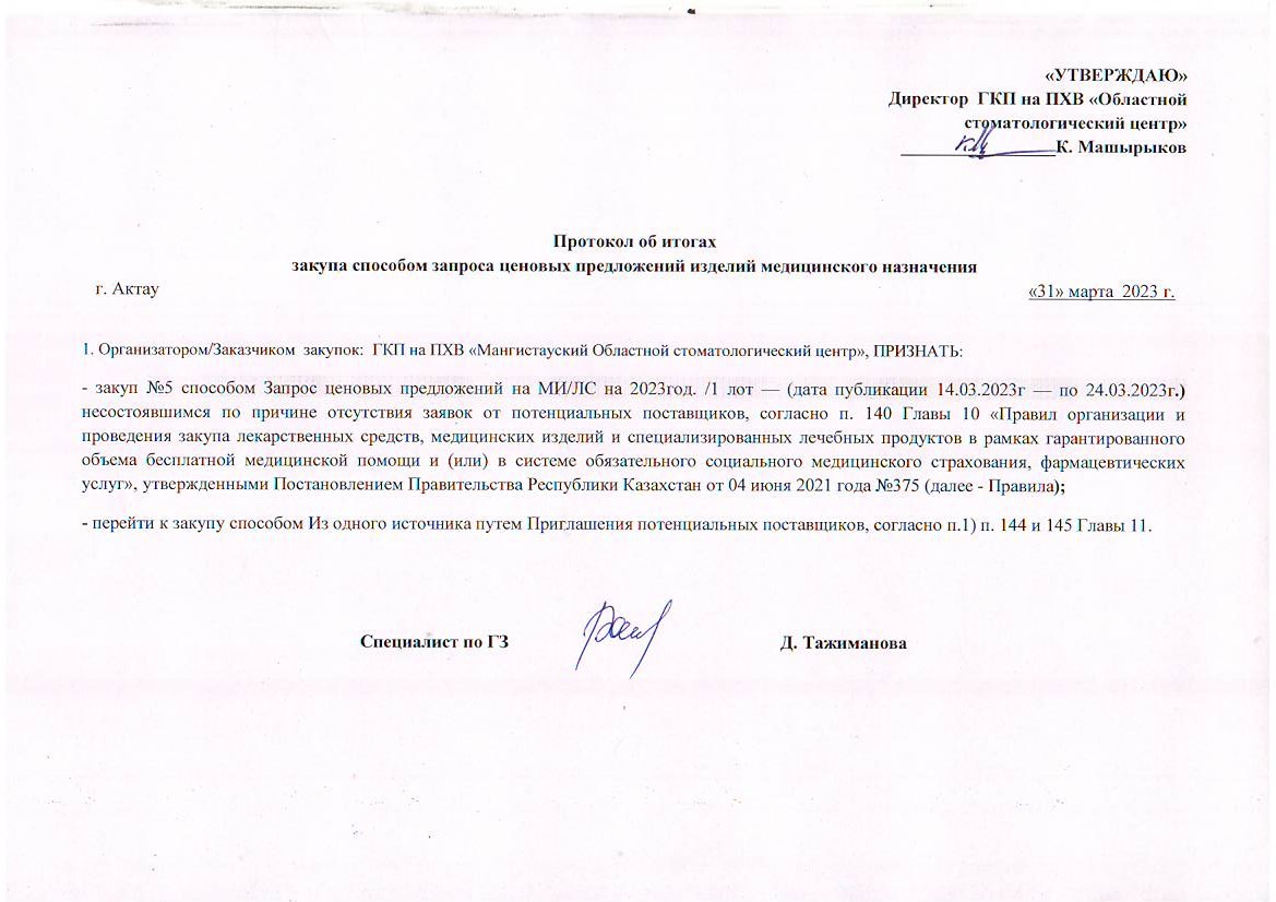 Протокол итогов по закупу № 5 от 14.03.23г — 24,03,23г (импланты 200шт) | скачать