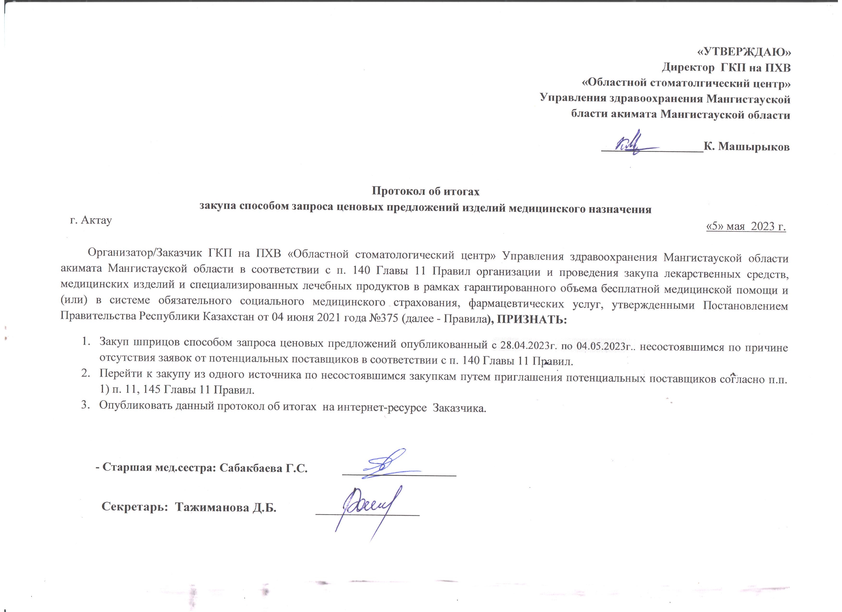 Протокол итогов Запроса ценовых предложений на ИМН (шприцы) / Срок публикации с 28.04.2023г. по 04.05.2023 | скачать
